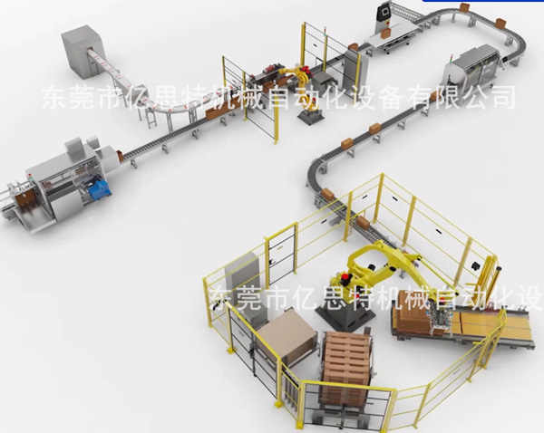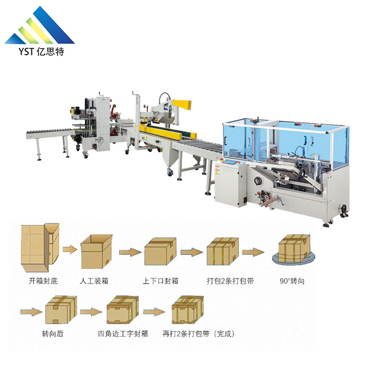自動開箱→自動裝箱→自動稱重→噴碼→自動I字型封箱→自動四角邊封箱→自動字型捆扎→碼垛系統(tǒng)→自動棧板打包→自動水平捆扎→自動在線纏繞→工作完畢